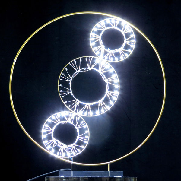 Le Boucher's "Luchrones" combine mathematics, chance and randomness into fine and delicate kinetic pieces. The metallic structure, micro-components and LED lights allow Le Boucher to play his musical scores with light.