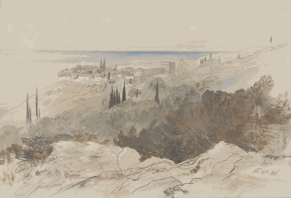 Greece had been a boyhood fascination of Lear's as he greatly admired Lord Byron from an early age, and the beautiful drawings of Mount Athos and Argostoli reflect his affection for the country. He wrote to his friend Chichester Fortescue before he first set out for Greece that, 'I cannot but think that Greece has been most imperfectly illustrated… the vast yet beautifully simple sweeping lines of the hills have hardly been represented I fancy - nor the primitive dry foregrounds of Elgin marble peasants &c. What do you think of a huge work (if I can do all Greece)? Lear travelled all over Greece from 1848 - 1864 but he never made a comprehensive record of the entire country.